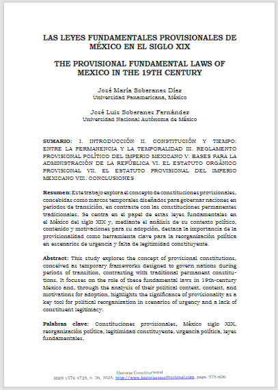 Soberanes Díez, J. M. (2025). Las leyes fundamentales provisionales de México en el siglo XIX. Historia Constitucional, 1(26), 575–606. https://doi.org/10.17811/hc.v0i26.1140